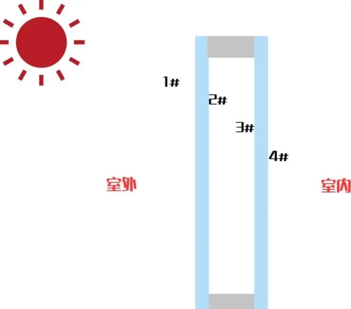 Low-E玻璃的膜层应该镀在中空玻璃的内侧,这个膜层非常容易被氧化,因此需要特别的保护。在中空玻璃的磨成过程中,以两层玻璃为例,它有四个面,由室外向室内分别是一二三四,磨成的话应该是至于玻璃的内表面,也就是2或者是3这个位置膜层,这取决于所处的地区和注重隔热还是保温。注重隔热的南方地区,Low-E的这个膜层,应该是放在第二的这个区域,阻挡更多的一个热量进入室内。若是在北方地区的话,Low-E这个膜层应该是放在第三的这个位置,阻挡更多的一个热量流失。