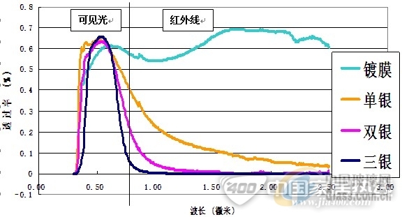 图中竖线左侧是可见光区域,这个区域曲线的高低反映的是玻璃的透光率。右侧是红外线区域,曲线下包容的面积反映太阳直接透过的热能。单银Low-E包容的面积最大(只比较Low-E),其次是双银,三银Low-E包容的面积最小,因此隔热性能最好。